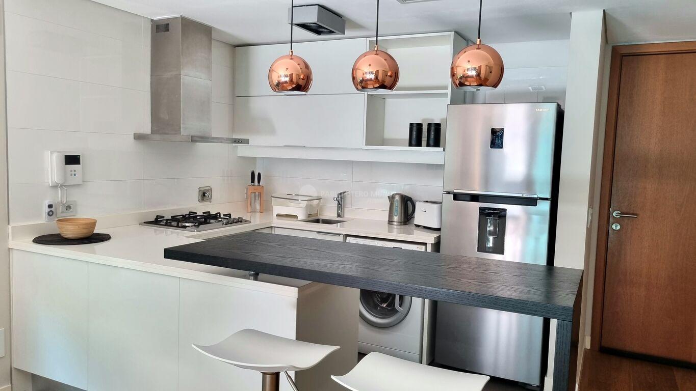 Cocina integrada, práctica y funcional, equipada con electrodomésticos de primera línea, incluyendo lavasecarropas.