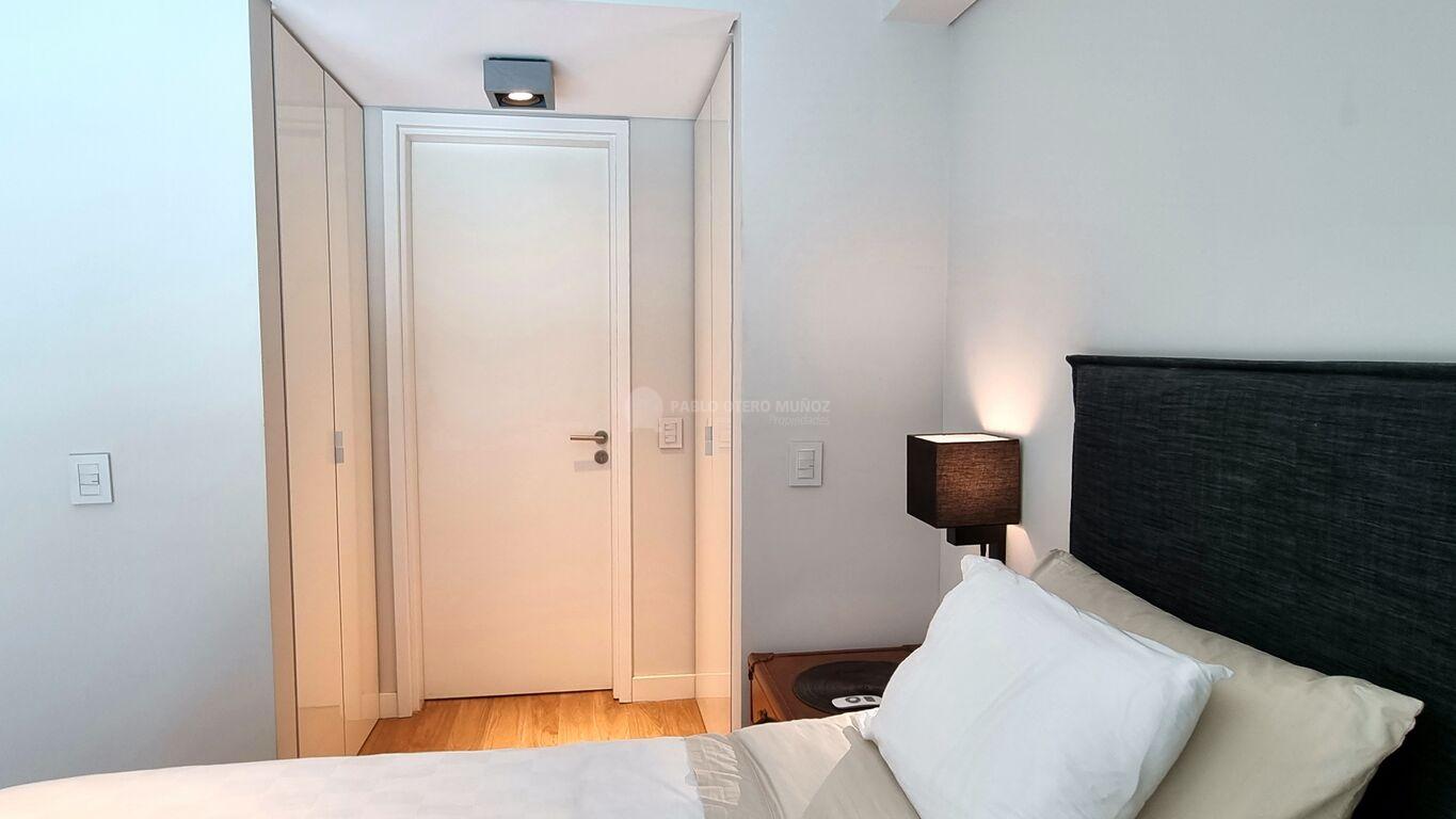 El dormitorio es en suite, con somier King Size español, iluminación y respaldo de BoConcept. Complementa el dormitorio un vestidor doble de Todesquini.